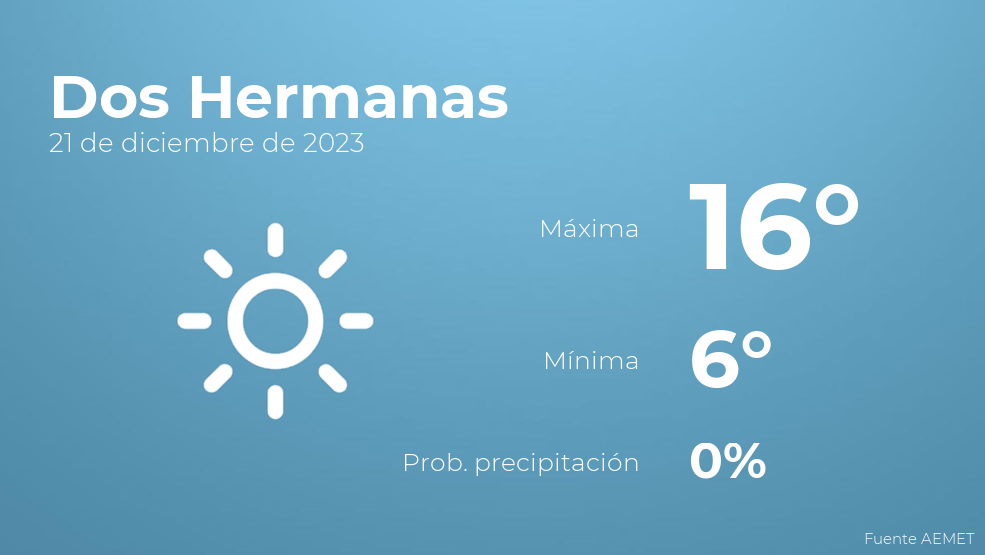Durante el día de hoy en Dos Hermanas tendremos cielos despejados. En cuanto a las temperaturas, variarán entre una máxima de 16 y una mínima de 6 grados centígrados. En general, vientos del noreste de poca intensidad.