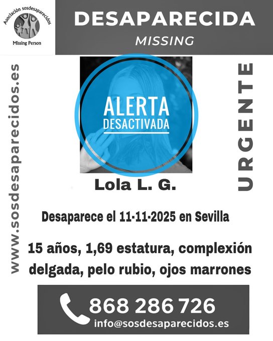 La asociación SOS Desaparecidos ha confirmado que ha sido desactivada la alerta emitida por la desaparición de una menor de 15 años en Sevilla, ocurrida el 11 de noviembre de 2025. La joven, cuya identidad no ha sido revelada públicamente por motivos de protección de menores, ya se encuentra localizada y en situación estable.