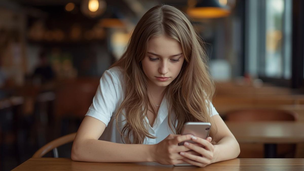 Chica joven navegando por redes sociales en su dispositivo móvil.