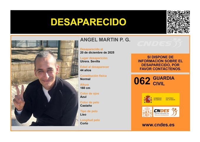 La Guardia Civil ha activado una alerta de búsqueda para localizar a Ángel Martín P. G., un hombre de 44 años que desapareció el pasado 20 de diciembre de 2025 en Utrera, Sevilla. El caso ha sido difundido por el Centro Nacional de Desaparecidos (CNDES), que ha publicado el cartel oficial con su fotografía y descripción.
