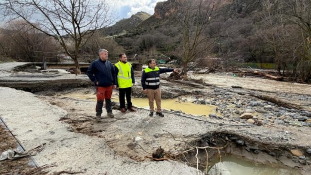 El diputado de Emergencias, Eduardo Martos, junto al diputado de Obras Públicas y Vivienda, José Ramón Jiménez, ha realizado una visita al municipio de Quéntar para inspeccionar los daños causados por el reciente temporal que afectó significativamente la GR-3201 y el área del río Aguas Blancas. Durante su visita, se anunció una primera ayuda de 10.000 euros destinada a limpiar los destrozos.
