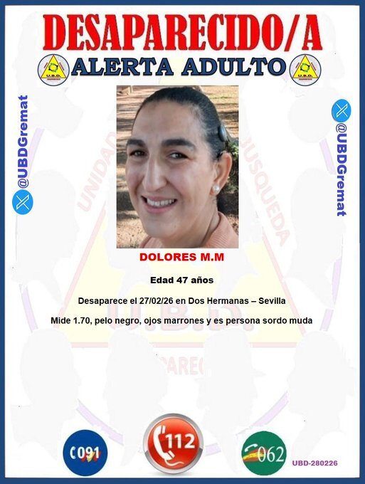 La desaparición de una mujer de 47 años mantiene activada la alerta en Dos Hermanas, en la provincia de Sevilla. Dolores M.M. fue vista por última vez el pasado 27 de febrero y desde entonces no se tienen noticias sobre su paradero, lo que ha llevado a la difusión de su imagen y características físicas a través de asociaciones especializadas.