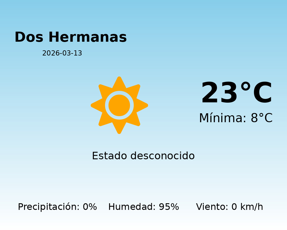 Hoy en Dos Hermanas, se espera un clima bastante agradable con temperaturas que oscilarán entre los 8°C durante la mañana y alcanzarán un máximo de 23°C por la tarde. A pesar de la ausencia de datos específicos sobre el estado del cielo, no se anticipan precipitaciones, con una probabilidad del 0%. Por lo tanto, es poco probable que debamos preocuparnos por la lluvia.