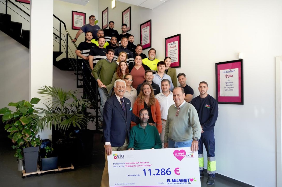 El Milagrito Industrias Químicas ha logrado recaudar un total de 11.286 euros gracias a su campaña solidaria “El Milagrito camina contigo”, una iniciativa desarrollada a nivel nacional durante todo el mes de febrero con el objetivo de apoyar a las personas afectadas por ELA (Esclerosis Lateral Amiotrófica), que se ha canalizado a través de la asociación andaluza en una acción apadrinada por Pepe Gastalver, jugador de rugby y empresario cuando se le diagnosticó la enfermedad hace ocho años y todo un ejemplo de resiliencia y de superación.