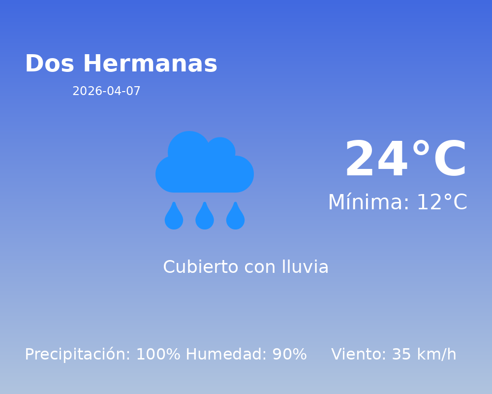 Hoy en Dos Hermanas, se espera un día bastante lluvioso y con presencia de condiciones climáticas variables. A continuación, te ofrecemos el pronóstico detallado para la jornada: