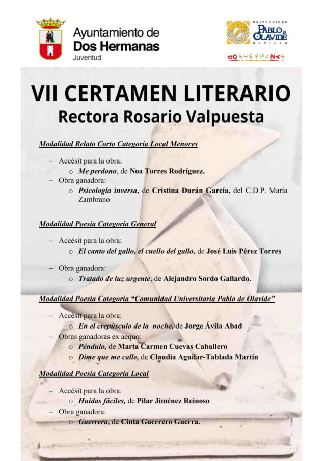 El Ayuntamiento de Dos Hermanas, a través de su Delegación de Juventud y el Programa Municipal de Prevención de Adicciones Dos Hermanas Divertida, promueve el VII Certamen Literario Rectora Rosario Valpuesta, que ha ganado reconocimiento en el ámbito literario nacional desde su creación en 2015. Este certamen busca ofrecer a los jóvenes alternativas de ocio saludable y fomentar la lectura y creación literaria.