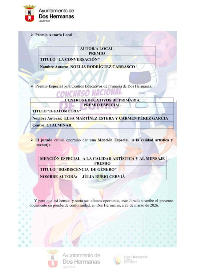 Además, se otorgó una mención especial a la obra “Irisdiscencia de género”, de Júlia Rubio Cervià, en reconocimiento a la calidad artística y el mensaje social contenido en el cómic.